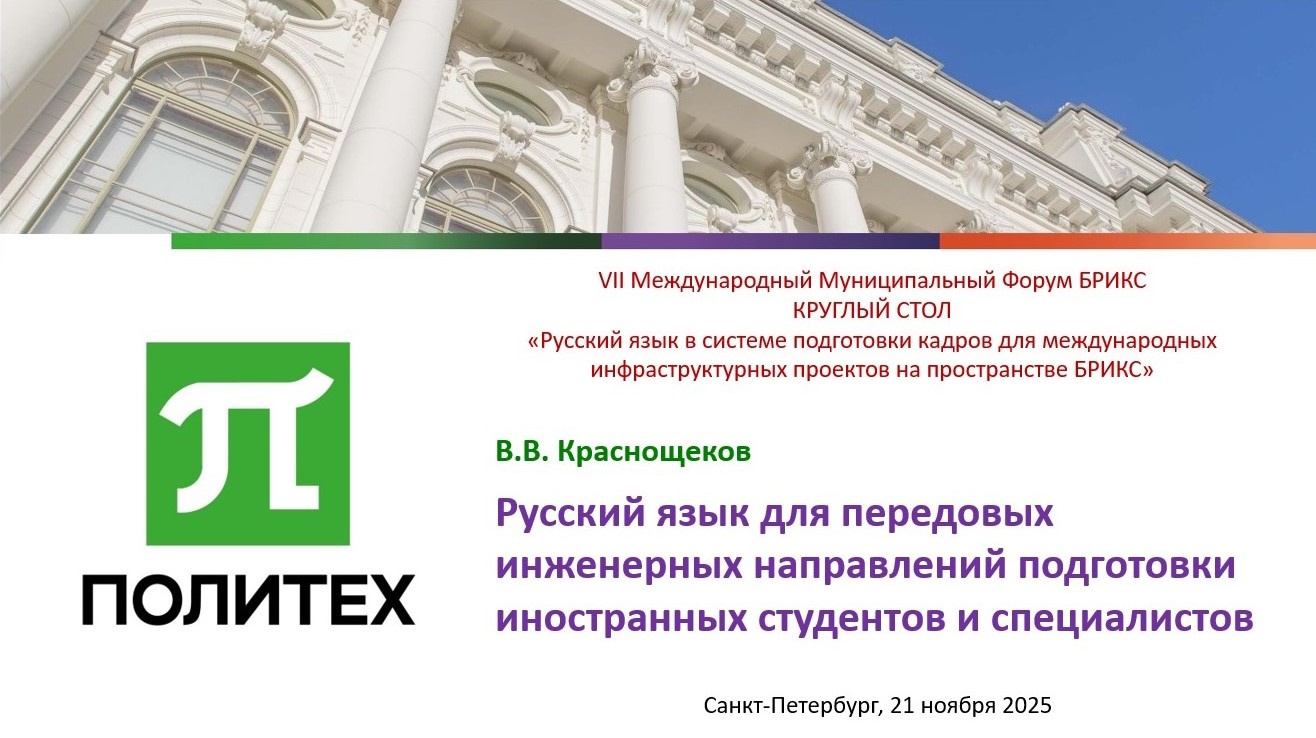 20−21 ноября в Невской ратуше состоялся VII Международный Муниципальный Форум БРИКС. Директор ВШ МОП В.В. Краснощеков представил доклад «Русский язык для передовых инженерных направлений подготовки иностранных студентов и специалистов» в рамках круглого стола «Русский язык в системе подготовки кадров для международных инфраструктурных проектов на пространстве БРИКС».